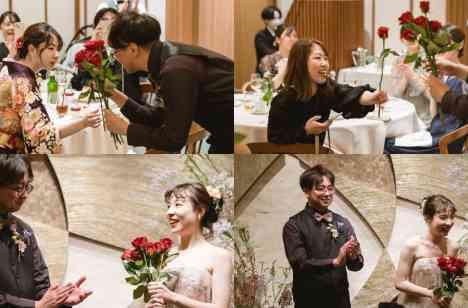 披露宴再入場時にはご新郎様からご新婦様へ特別なサプライズ…ご新郎様が各テーブルからバラを1本ずつ集めてご新婦様にプレゼント毎年のお誕生日に赤い薔薇11本の花束をプレゼントしプロポーズではオレンジの薔薇を1本加えて12本の薔薇をプレゼントされたそんなおふたりの物語をゲストの皆様と共に再現皆様とっても笑顔であたたかい愛に満ちた瞬間でしたゲストの皆様も一緒に参加して創り上げる特別な演出です