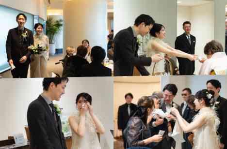 ゆっくりと退場の時間拍手に包まれながらおふたりの目にはこらえきれない想いが滲みますその姿を見守るご家族の表情には安堵とよろこびが重なっていました 想いはちゃんと届いているそう感じられる空気が会場に残りますそしてお見送りの時間「ありがとう」と「おめでとう」が交わされるなかでこの一日が自分たちらしいかたちで結ばれたことをおふたり自身もそっと実感していました