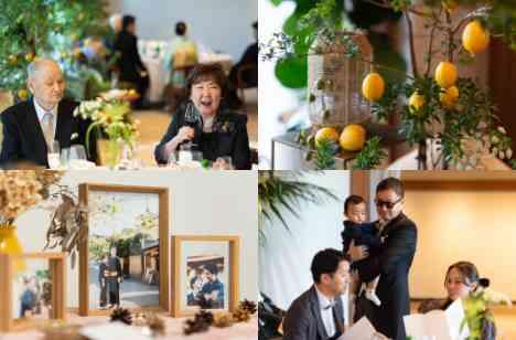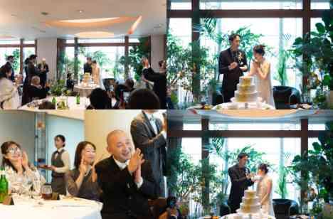 会場の視線がそっと集まる中おふたりはケーキの前へ グリーンに囲まれレモンの彩りをまとったこの日のためのウェディングケーキ祝福の拍手に包まれながら並んでナイフを握りゆっくりと最初の一歩を刻みます会場にはあたたかな拍手とたくさんの笑顔が広がりました続くファーストバイトでは思わずこぼれる笑い声見守る家族の表情にも自然と笑みが浮かび会場全体がやさしい空気に包まれていきます