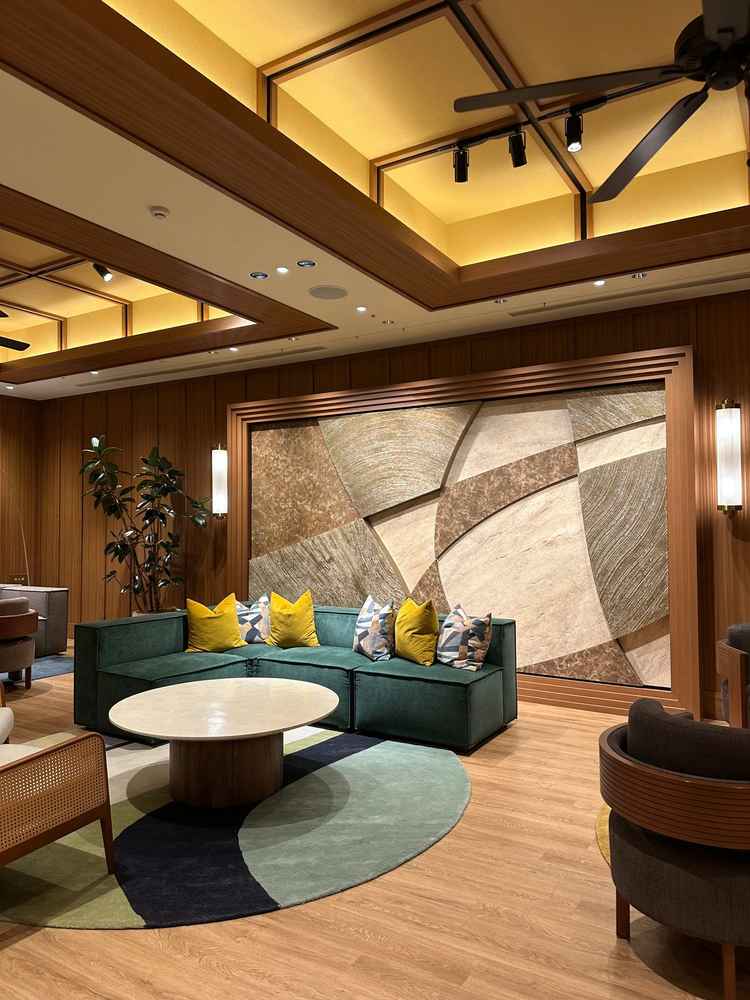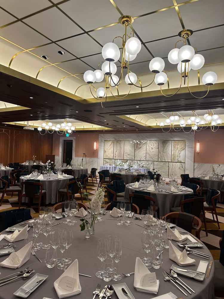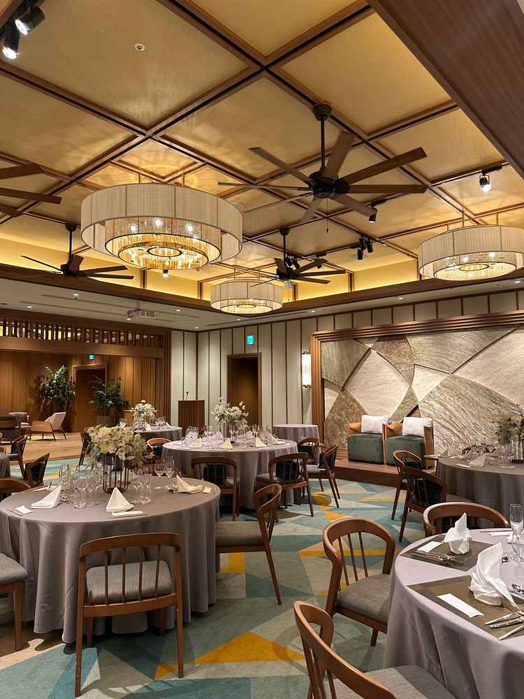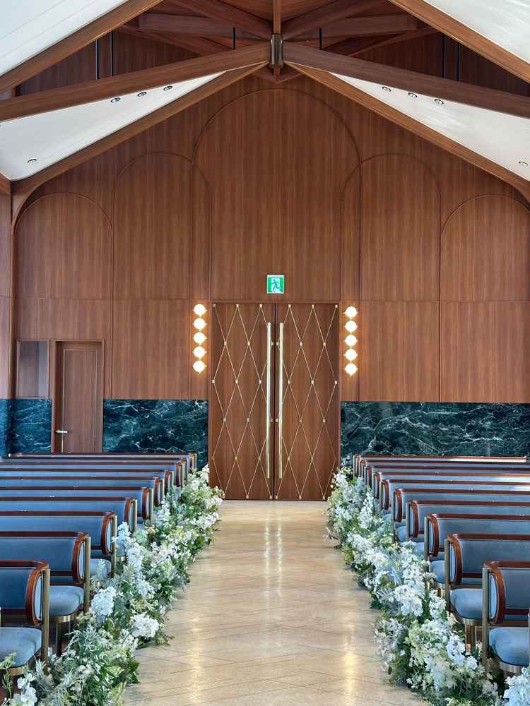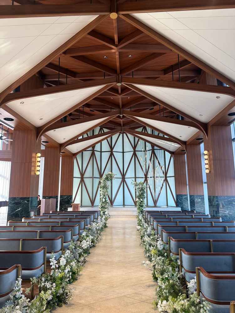 外光を取り入れて開放感のあるチャペルでした。披露宴会場はミッドセンチュリー風で可愛らしいデザインで素敵でした。
