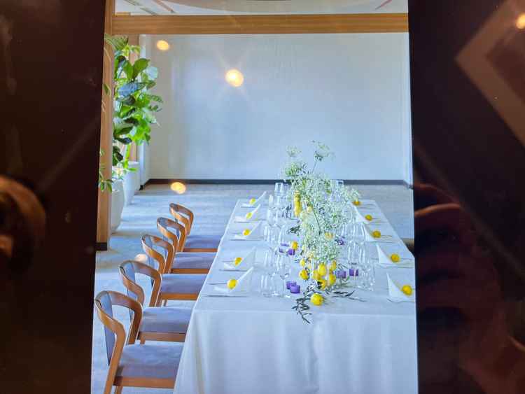 披露宴会場は複数あり、それぞれのスタイルに合わせて選べるのが魅力的でした。特に少人数向けの会場は、さいたま市内では珍しく、15名程度の会食を希望していた私たちにとって理想的でした。会場内は白とベージュを基調とした上品な内装で、落ち着きのある雰囲気。大きな窓からは自然光が差し込み、昼間は明るくナチュラルな雰囲気に、夜はライトアップでラグジュアリーな空間に変化します。テーブルコーディネートの自由度も高く、自分たちらしい雰囲気を演出できそうです。スクリーンや音響も整っていて、演出にも対応できる安心感がありました。