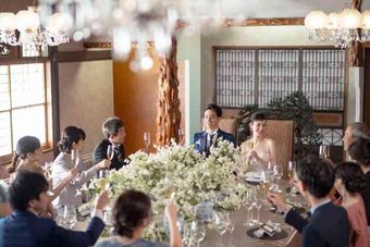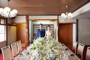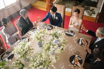広すぎない会場だからこそ、ご家族、ご親族のみでゆっくり過ごせる会食会会場。お話やお食事を中心とした派手すぎない会食スタイルでの結婚式をご希望の新郎新婦様に人気をいただいております。