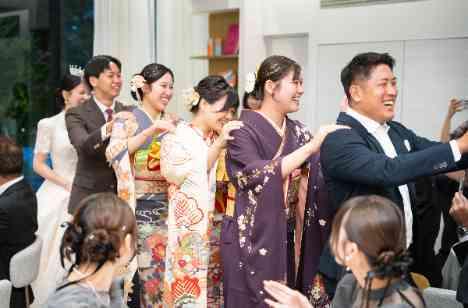 「ありがとう」を伝えたい方がたくさんいて感謝を伝える方法を悩んでいたご新婦様・・・もう一緒に呼んでしまおう!と、感謝を伝えたい方を一斉にお呼びし、1人1人にしっかり感謝を伝えることにしました。 初めて出会う方同士もいましたが、自然と笑顔が伝染して、自分にとっての大切な方同士も縁が繋がった気がして嬉しくなりました♪最後はみんなで列をなして、会場を笑顔で歩き回り、すごく幸せでした!