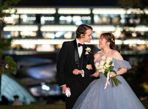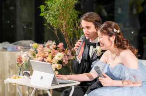 カナダご出身の新郎様と日本出身のご新婦様のグローバルウェディング!海外からご参加のゲストにも日本在住のゲストにもどちらも楽しんでほしい、お互いの国や大切な人のことを知ってほしいと考えたおふたりは、両方の文化を取り入れつつ、より自由でよりナチュラルな海外風パーティを行うことに! パーティ中は海外にいらっしゃるご友人と中継を繋いでお話するシーンも…型にはまらずおふたりのやりたいを叶える特別な1日に。