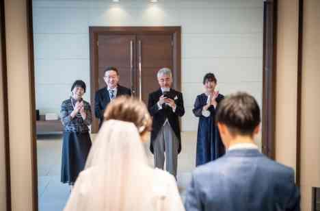 お2人の晴れ姿をとても楽しみにされている親御様。 親御様にしっかり感謝を伝えてくために挙式前に大切なお時間を作っていました。 本来であれば挙式の入場時に晴れ姿をお見せするのが通常ですが、親御様にはサプライズで挙式前の時間にご案内。親御様にはお2人の「1番最初に晴れ姿を見てほしい」という強いご希望からこのような特別なお時間を設けましたとお伝え、そしてご対面。挙式に温度感が上がる瞬間でした。