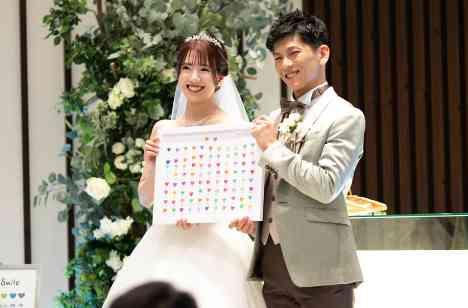 挙式入場時は、新婦のウェディングドレスからブーケまで全て白基調で統一。"WEDDING SMILE"と名付けられた結婚証明書「結婚生活で大切なものは?」という問いかけに対して、ゲストに7色のカラースタンプで答えてもらう、オリジナルアイテムをご用意!挙式が進むにつれて、色鮮やかになっていきます。おふたりの未来がより明るくなるように、願いを込めて・・・!
