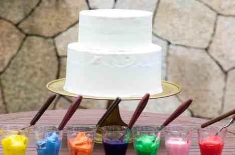 ウェディングケーキセレモニーのお時間!BGMがかかり、ガーデンに運ばれてきたのは、真っ白なケーキと7色のペイント。その場で、ナナイロのケーキに仕上げていきました!ゲストからの「もっとこうして!赤!黄色!」などワクワクした歓声が飛び交います。完成したケーキは、幸せのお裾分けとして、後ほどゲストの皆様にも提供されました。