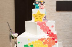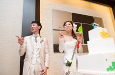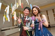 ゲスト想いなお2人。参列していただいた皆様に楽しんでいただきたいとのことでした。新郎様は今まで出席してきた結婚式とは違う事をしたい!ならばテーマを七夕にしませんか?と提案させていただきました。皆様参加型の演出をお2人と一緒に考えました。ケーキもお2人が好きなミッキーとミニーをのせて七夕仕様にいたしました。