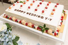 披露宴でご用意したウェディングケーキは新婦様が元パティシエールということもあり、ご友人にもご協力をいただいて世界に一つだけのウェディングケーキが完成しました!入刀してしまうのがもったいないくらい。昔からケーキが大好きだったという新婦様はファーストイートのセレモニーでケーキを口にしながら本当に幸せそうでした。ゲストの皆様にも幸せのおすそわけとして提供されました。