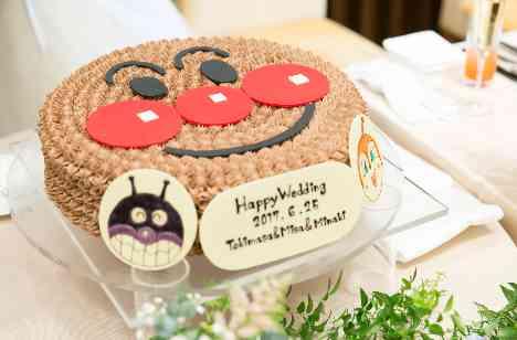 ケーキはアンパンマンケーキ。ミュゼのパティシエがアンパンマンマーチに合わせて入場。デザートのお時間は、お二人と考えた1つ1つ表情の違う「アンパンマンタルト」がゲストに配られ、心温まるお時間が多くありました。