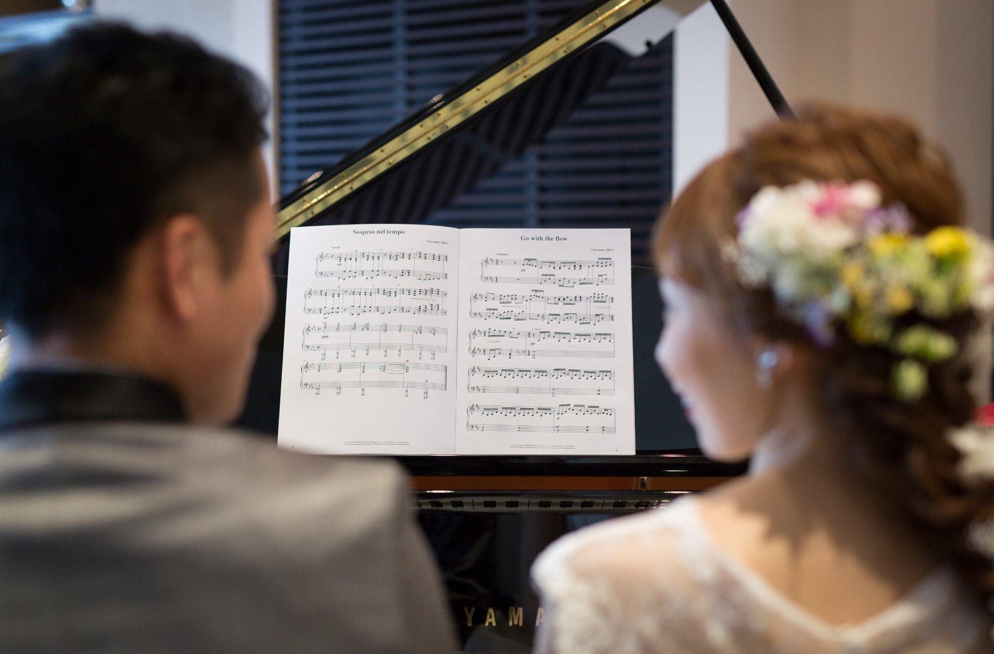 お式前日に、ミュゼ四ツ池での前撮りを行いました。 当日のお衣装を着て館内を歩き 当日と同じヘアメイクスタッフ、カメラマンにより撮影をさせて頂くことで 1日のイメージが沸いたことをお伺い致しました。 また、ある楽譜の貸し借りにより交際に発展されたお2人 前撮りの中で思い出の楽譜やピアノと共に撮影されるシーンもございました。
