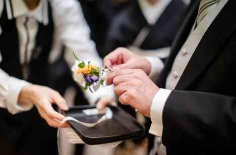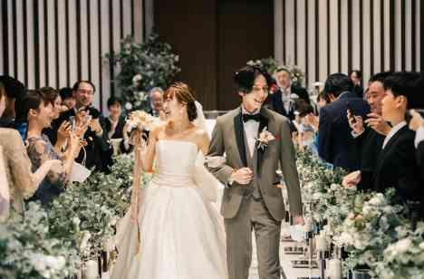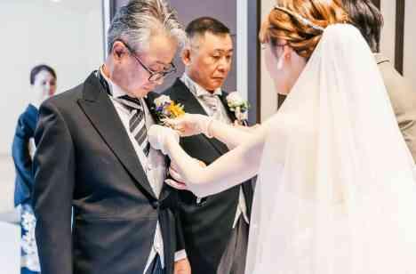 最後の願いを問いかけたのは両家のお母様。 その短冊の裏には薔薇のイラストが印されています。 薔薇のイラストを示すのは「お父様のブートニア」 実はブートニアの中にお二人の大切な「結婚指輪」が隠されているのです。 今までずっと近くで見守ってきてくれたお父様が指輪を届けます ゲストからの誓いを胸に、指輪の交換をしてパーティーのフィナーレです!