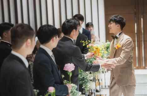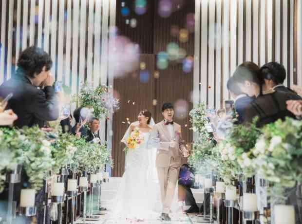 挙式では大切なゲスト17名に参加してもらう「17フラワーセレモニー」の演出を取り入れました。ゲストから集めたお花をブーケにし、新郎様から新婦様へ。誓いの言葉をそれぞれのご友人からいただき、感動あり、笑いありの挙式となりました。おふたりの退場はチャペルにしゃぼん玉が溢れ記憶に残る素敵なシーンとなりました。