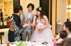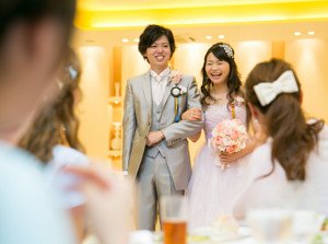 再入場は新郎様の地元岡山県名物きびだんごと新婦様の地元静岡名物うなぎパイのサーブを行ないました。岡山ゲストへはうなぎパイ、静岡ゲストへはきびだんごをお二人から直接お渡ししながらご挨拶周りをしてそれぞれの地元のご紹介をしました。ラウンド曲もきびだんごを連想させる桃太郎のBGMをセレクト!会場内も笑いに包まれました。