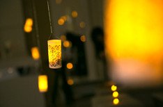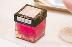 再入場後はキャンドルの舞う空間を感じられるよう、ゲストのテーブルにも点火したキャンドルを一つずつ置き、新郎新婦様はゲストのテーブルにキャンドルサービスをしながら周りました。会場内がキャンドルの光で温かく灯され、新郎新婦様と皆様の幸せに願いを込めて一斉に火納め。会場内が明るくなったところで手元を見ると新郎新婦様からゲストの皆様への感謝の気持ちがメッセージとして浮かび上がりました。