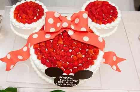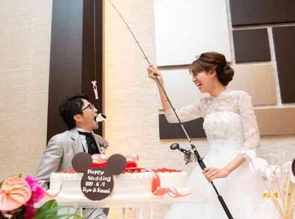お2人のケーキは新婦様が大好きなディズニーのミッキーの形でご用意しました。 新郎様へのファーストイートには新郎様の好きな釣りにちなんで釣り竿で行っていただきました! また後半のデザートブッフェもたくさんのミッキーで溢れていました。