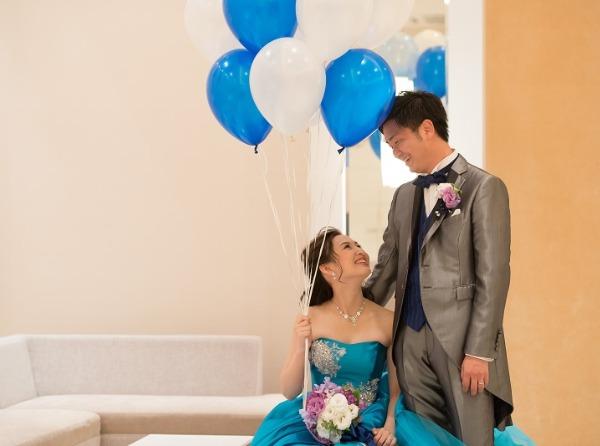 テーマカラーはブルー×ホワイトにて 会場の装飾、ペーパーアイテム、ブーケ カラードレス全てテーマカラーに合わせて準備を進めて頂きました。 テーマカラーを設けることで統一感のある結婚式に仕上がることはもちろんのこと、 結婚式の準備の手助けになり、おふたりらしい結婚式となります