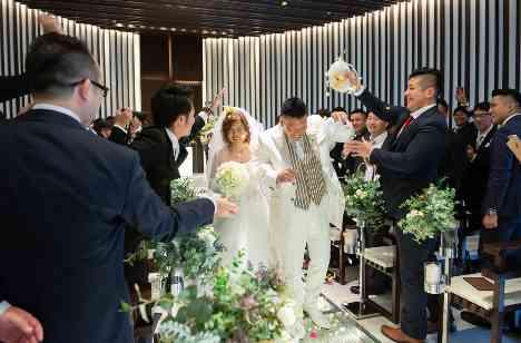 挙式はきちんと行いました。 セレモニーは厳かな雰囲気で進められました。 退場の際にはフラワーシャワーで皆様に祝福をしていただき笑顔での退場になりました。 挙式後のセレモニーではサッカーをしている新婦様からサッカーボールトス アメフトをしている新郎様からアメフトボールトスを行っていただき 皆様がとても盛り上がっていました。