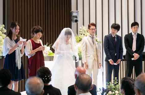 挙式はゲストの皆様にも参加していただきたく 人前式で行いました。 誓いの言葉では事前にゲストの皆様に誓いの言葉を考えて投票していただき お2人の抽選で当たった4名様にご協力いただきました。 指輪の交換ではお子様がリングベアラーとなりご新郎様が操作するリモコンカーに乗って登場! ウエディングキスではお2人からお子様のほっぺへキスをしていただきました!
