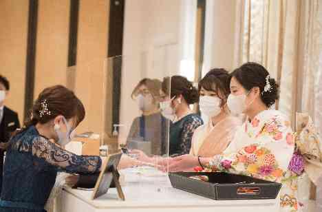 友人のゲストはもちろん、ご年配のご親族を招待したおふたり。できるかぎり安心して来てほしい、とおふたりはマスクケースを各卓に置くなど工夫しました。式場側でもスタッフのマスク着用や検温、消毒はもちろん、受付にアクリル板を設置したり食事以外の時はマスク着用を依頼するなど、万全の対策で結婚式当日を迎えました!