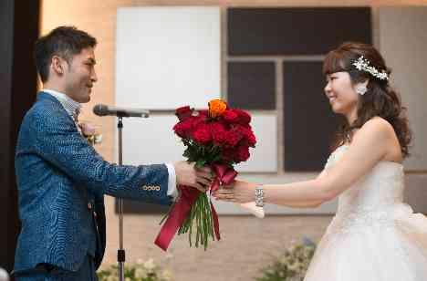 披露宴では、新郎様がサプライズで「ダーズンローズセレモニー」を。ゲストが内緒で持っていたバラを新郎様が集めていき、 新婦様へ渡しながらプロポーズ! 今までの感謝、新婦様への気持ちを伝えました。 大切なゲストと新郎様の想いが詰まった12本のバラに、 思わず新婦様も会場のゲストも、スタッフも、感極まった場面でした・・。