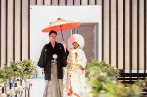 挙式は和装人前式。水に浮かぶ幻想的なチャペルは和装姿も似合います。入場は和傘を手にお二人で。ゲストの皆様に見守れながら祝福に溢れる空間です。また誓いのキスでは新郎様が片膝をつき、新婦様の手に...。ドラマティックな瞬間に心温まります。さらに折り鶴シャワーなど和装ならではの演出も。安心して参列してもらえるよう、感染症対策も徹底いたしました。