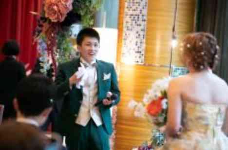 再入場の時、 会場内にある大きな階段から現れたのは新郎様お一人 新郎様の足元は革靴からスニーカーへお色直しをしました 新婦様は?? そんなゲストの反応の中新郎様は入り口に背を向けます 実は新婦様、新郎様へお色直しのドレスを秘密にしていました! ゲストも見守る中新郎様へのファーストミートが行われ とても盛り上がりました!