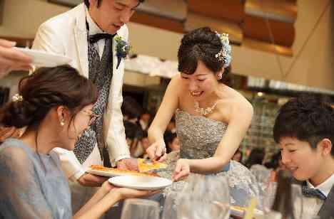 ウェディングドレスからカラードレスにお色直しした新婦様。入場後にゲストのテーブルを周り、写真を撮影していきます。そこで新郎新婦からピザサーブもしちゃいます! 名物のスモークサーモンピザが焼きたてで登場! 新郎新婦から想いのこもったサーブがゲストへ届けられ、会場内がぐっと温かい雰囲気になりました。
