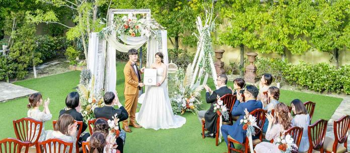 プライベートなガーデンを使って青空の下、緑に囲まれて愛を誓う感動のガーデン挙式。