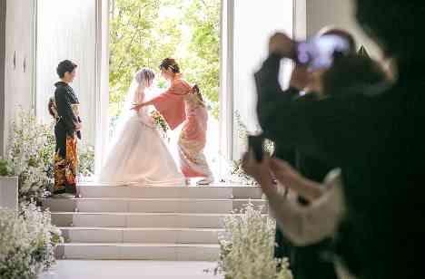 挙式のエスコートをお願いしたのは、新婦様が生まれる前、生まれた瞬間、そして今までの時間を誰よりも一番一緒に過ごしたお母さま。思い出を振り返り入場前に少しうるっとされた様子でした。また、最後のお支度“ベールダウン”をお願いしたのはお姉様。これから幸せになってね、の気持ちを込めてベールを整えていただきました♡