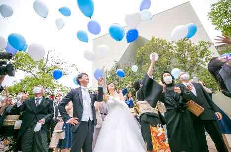 ゲスト参加型の演出としてご用意された“バルーンリリース”バルーンリリースには、「二人の幸せが天まで届くように」という意味が込められています。太陽の光を浴びながら空へ舞うカラフルなバルーンの数々にゲストの皆様から「綺麗!」と歓声があがりました!!お色味はおふたりのメインカラー“ブルー”で統一してご用意されました^^