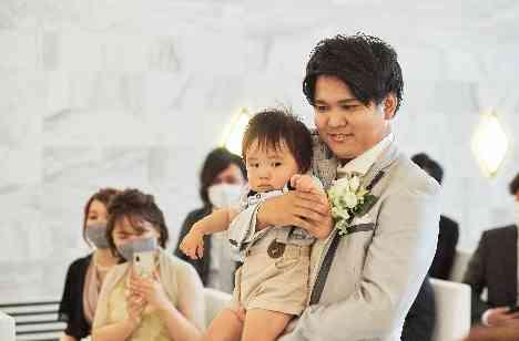 打合せでもずっとお子様のお世話をされていたご新郎様。「大好きな息子と一緒に何かできないか」と考えられておりました。お子様にお手伝いしていただいたのはなんと・・・挙式の入場シーンで抱っこしながら登場!!さらに背中のリュックにはおふたりの大切な結婚指輪がはいっており、リングチャイルドとしてのお役目も頑張っていただきました☆