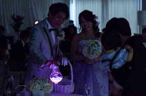 大変な時期に集まってくださったゲストのみなさまへ楽しんでほしいとの思いで取り入れられた“光の演出”お色直しでお選びいただいたパープル色のドレスと合わせて、光の色もパープルに★「今日は来てくれてありがとう!これからもよろしくね」の気持ちを込めて花びらを入れると優しい光に包まれ、心温まる演出となりました♡