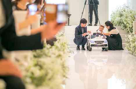 挙式の感動的なシーン指輪交換。 しかし署名台におふたりの指輪が見当たりません。 後方からブーンとかっこよく登場したのはなんとおふたりのお子様!キッズカーに乗っての登場です☆ たくさんのゲストにすこし緊張気味でしたが、皆様が見守る中、おふたりの元へしっかり指輪を運んでいただきました!おふたりからは頑張ったねのキスを♡