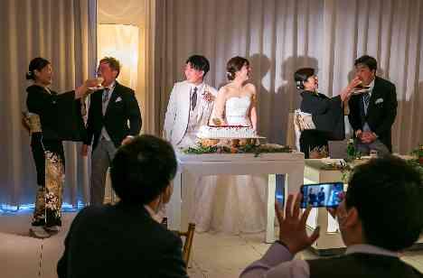 親御様にも記念になるサプライズをしたい!とご希望のおふたり。 当日お願いしたのは「お手本バイト」!!おふたりのファーストバイト前にお手本を見せてもらうというサプライズ演出です。 お名前のお呼び出しを行った瞬間、少し照れた様子のご両家親御様でしたが、お手本バイトでは新郎新婦様も見たことのない意外な一面を覗けるシーンとなり盛り上がりました♪