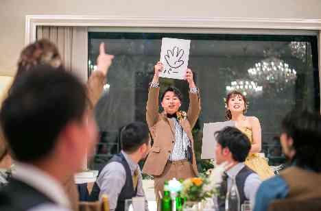 ゲストの皆様へのサプライズ演出はまだまだ続きます。次にご用意されたのは“ロシアンシュークリーム”!新郎新婦様からお席毎にお配りし掛け声で一斉にパクリ☆なんとハズレにはからしが…。各テーブルから歓声があがりました♪そこから更なるサプライズ…からーい思いをして頑張っていただいた方には豪華景品獲得を巡ってのじゃんけん大会へ参加いただきました!ご新郎ご新婦様からのサプライズに皆様大盛り上がりでした♪