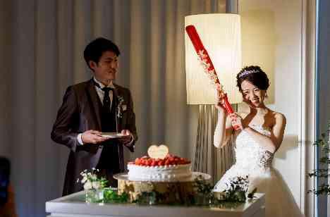 初めての共同作業“ケーキ入刀”演出の後、新郎新婦がお互いにケーキを食べさせ合う演出“ファーストバイト”新郎から新婦へは「一生食べるものに困らせない」、新婦から新郎へは「一生美味しいごはんを作ります」という意味が込められていると言われています。ご新婦様からの一口はおおきなアイテムで!真っ赤なバットスプーンをお持込みいただきました♪スプーンいっぱいの大きいケーキにかぶりつく新郎様、大盛り上がりでした☆