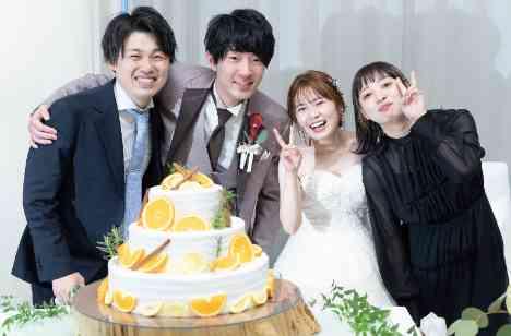 披露宴で大好きなご友人様へと考えられた演出はサプライズバイト!!おふたりのファーストバイトが結んだ後、実は…とのコメントで呼び出されたご友人様。びっくりしたご様子でしたが、おふたりから愛のこもったケーキにとても喜ばれていました♡仲良く皆様でのお写真も♪ケーキにもこだわり、オレンジがお写真映えする流行りのデザインにされました☆