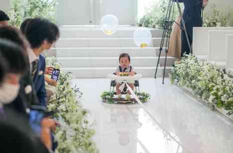 ご新婦様はご家族様思いのとてもステキな方。お姉様とも仲が良く、甥子様の誕生もとても喜ばれたそう。ぜひお手伝いを!と考えられたのは指輪を運ぶお手伝いリングボーイ☆大切な日のアイテムは気持ちを込めて…歩行器の装飾はお姉様、リングピローはお母様の手作りでご用意されました♡そして…皆様が見守る中、新郎新婦様の元へ指輪を届けていただきました♡