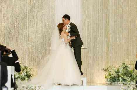 ゲストの皆様は新郎新婦様がどこから再入場されるのかドキドキに包まれていました。 音楽がかかり、ご入場口のカーテンが開くと”独身”の文字が、、、! するとご新郎様が独身をやぶり勢いよくご入場!階段からご入場されるご新婦様を迎えにいっていただき、おふたりで高砂席まで♪どの場面でもユーモアを取り入れるおふたりらしいご入場でした!