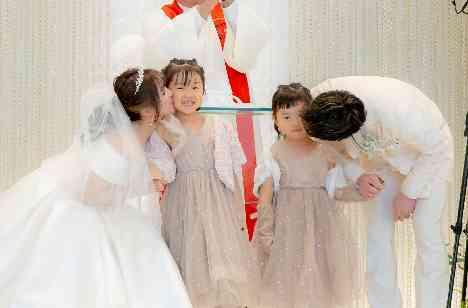 ご結婚式ではかかせないウエディングキス。 実はウエディングキスはする場所により意味が様々ございます♪おふたりが選ばれたのは、これからの幸せをわが子に誓うという意味も込めて、大切で大好きなお子様に♡ 最初は緊張していたお子様も、大好きなお父さん、お母さんの一番近くにいられることで、笑顔になっってくれました♪ ファミリーキスは家族の一生の思い出になりますね♡