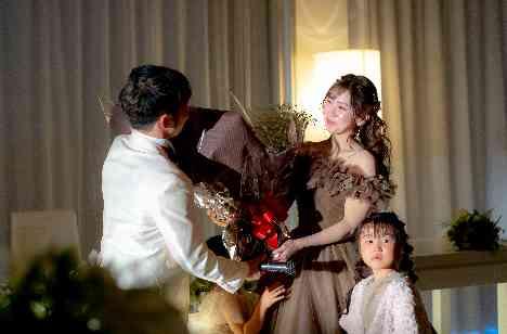 ご新婦様には内緒でサプライズプロポーズを計画されていたご新郎様。さらにサプライズのムービーもご準備されていました。ムービーをご覧になった新婦様の目には涙が、、、そしてムービー上映後、大きな花束をもったご新郎様がご登場。 、婚約指輪とともにプロポーズの言葉をお伝えしました。 大切なお子様とゲストの皆様に見守られながらの サプライズプロポーズです♡