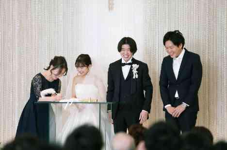 結婚式ではおふたりに誓いとして”結婚誓約書”へご署名をいただきます。 そして人前式は大切なゲスト様にも結婚誓約書へご署名をいただきます。 おふたりが選ばれたのはお互いの大切なご友人様♪ 実はゲスト様にはサプライズでご準備を。 お名前が呼ばれた瞬間、ゲストのおふたりは驚きの表情でした! 大切なゲスト様に結婚の証人をしていただく”人前式”は おふたりらしさ溢れる素敵なお式となっております♡