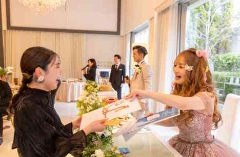 結婚式の思い出作りに、 従来のセルフィーと一味違った楽しさで、 両家参列者様が一緒にに撮影したことで、 仲が深まりました。 おふたりのたいせつなゲスト様に、 楽しんでいただけるように、 レシートフォトをお待合スペースにご用意されました。 お待合のお時間から会場が笑顔で溢れておりました。