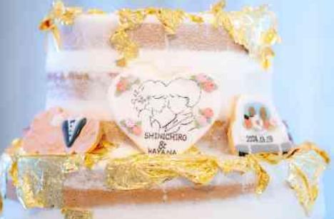 とてもお洒落なおふたり。 ケーキにもこだわりたい!と オリジナルウェディングケーキを用意しました。 アイシングクッキーと金箔でデコレーションし 一から作るケーキは、おふたりらしい 世界に一つしかないケーキです。 ケーキの登場に「かわいい!」「オシャレ!」と 大盛り上がりでした^^ お写真も沢山撮っていただき、 ゲストからも大好評でした。