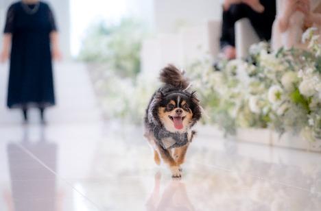 挙式では”リングドック”として大活躍!! たいせつな指輪をおふたりのもとへ 運んでくれました。 バージンロードを歩く姿に 全員がほっこり(^^) 緊張しながらも一生懸命頑張る姿に、 ゲストの皆様も思わず笑顔に。 温かい時間が流れ、 チャペル全体がやさしい空気に包まれました。 おふたりにとって、わすれられないワンシーンとなりました♡