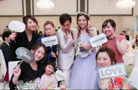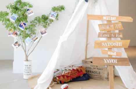 ゲストの注目を集めたのは、フォトジェニックなDIYアイテムの数々。受付にはボードタイプの席次表、フォトブースには木目調の大きなパネルを飾るなど、広い空間を活かして自由にコーディネートした。さらに、会場内には手作りのテントを張ったキッズスペースを用意し、子ども連れのゲストにも楽しんでもらえたそう。