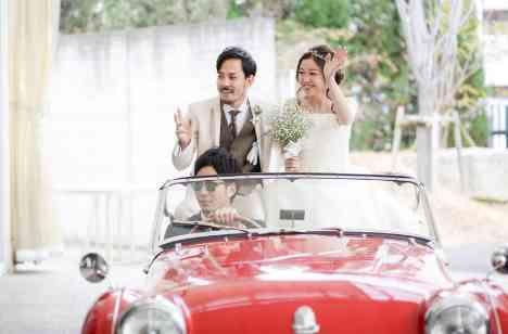 新郎新婦がオープンカーに乗って登場し、披露宴が幕開け。ブロッコリートスを受け取った友人ゲストを、運転手に指名するサプライズも盛り上がった。後半はフォーマルなコース料理から雰囲気を変えて、シェフが目の前で仕上げるビュッフェスタイルに。「メインのお肉を豪快にフランベする演出に歓声が上がりました」。