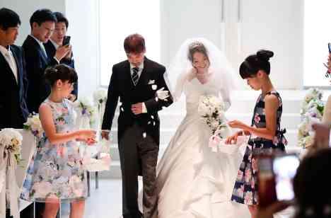 挙式の入場には新郎の姪っ子にフラワーガールを努めてもらい、真っ白な大理石のバージンロードに華を添えてくれました!お花の香りに包まれながら、お子様の可愛らしさに緊張がときほぐれたそう!振り返るとそこにはフラワーロードが♪