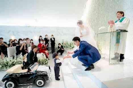 おふたりのお子様にリングを届けるお手伝いをお願いしました。登場はなんと…キッズカー!!ちょっぴり緊張しながらも、パパの元に大切なリングをしっかり運んでくれました♪この後、頑張ったねの気持ちを込めてお子様のほっぺにウェディングキスを♡